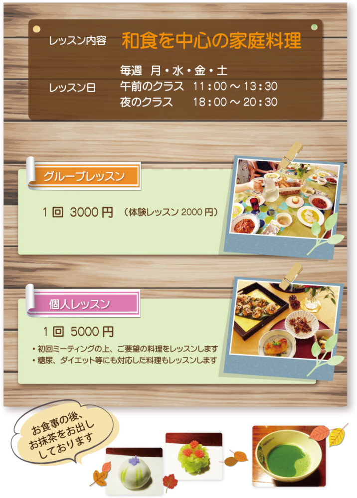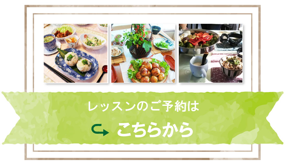 | 長い間、大学病院勤務する中、食事制限をしなければならない患者さんたちを指導してきました。食べることが大好きな私にとりまして、食べることの喜びを無くしてしまうのではないかと悩みながらも患者さんたちの快復に取り組んでいました。生涯健やかに美味しい料理を食べ続けていくための料理を創り、分かち合って行きたいと料理教室を開きました。集ってくださった生徒さんたちとともに学びながら楽しくレッスンしています。どうぞお気軽にお越し下さいませ。 | ![]() |